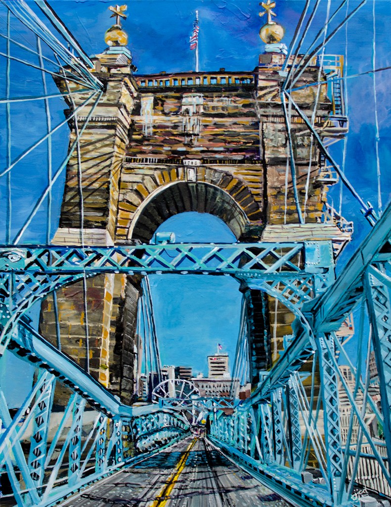 OntheRoeblingBridge Published August 23, 2019 at 966 × 1251 in On the Roebling Bridge | Cincinnati, Ohio On the Roebling Bridge | 30″ x 40″ Acrylic on Canvas