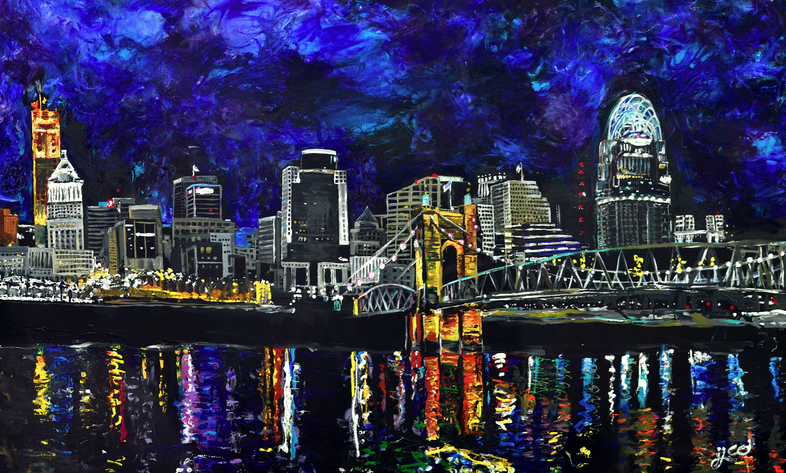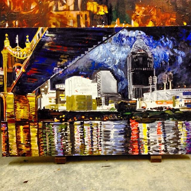 Here’s another painting inspired by the beautiful Cincinnati Skyline. This 24″ x 36″ acrylic on canvas painting of the historic John A. Roebling Suspension Bridge, titled Golden Evening Suspension. This painting showcases the strong foundation and vivid structure of this iconic Cincinnati landmark. The perspective for this piece is from Covington, Kentucky, so you’ll notice a small section of the Cincinnati skyline on the opposite side of the bridge.