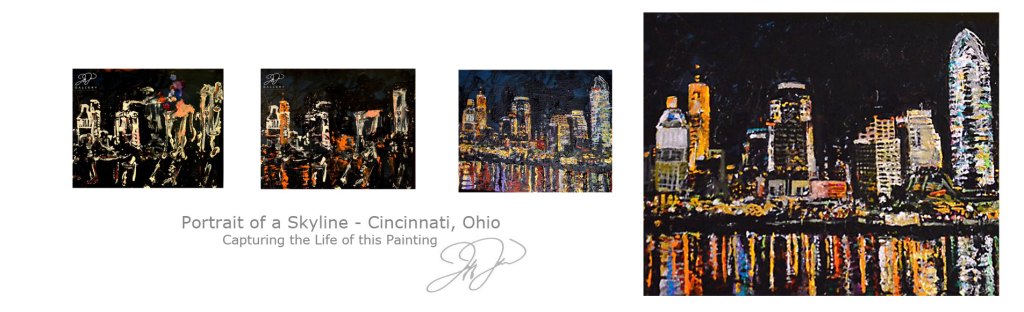 Excited to share the progress on our latest commission painting of the Cincinnati skyline titled, Cincinnati in April | 30″ X 40″ Acrylic on canvas by Jeff Johns and Colin Daugherty, JJCDcollaborations™
