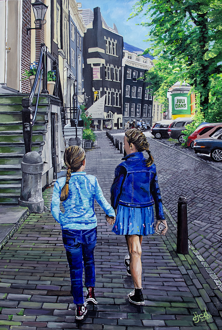 Here’s the final capture on this painting that captures the love between two sisters as they were on a family vacation in beautiful Amsterdam. The cobblestone moss filled roads, combined with the beautiful architecture really make this painting shine. There are multiple aspects to this painting that I really love. From a painting perspective I love the glow of light radiating from the right corner by the Juli Dans sign. The other component of the painting is that it really brings to life our passion of painting cities and combines it with human emotion. Thrilled with the final result and could not wait till our client had a chance to see it in person for the first time.