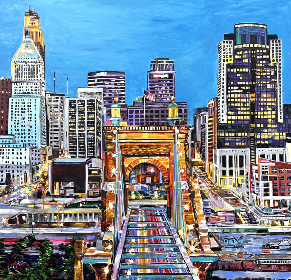 Here’s a look at one of my latest cityscapes. This here is an aerial capture of the beautiful Roebling Bridge leading right to the Cincinnati Skyline. Love all the color and energy in the center of the painting leading right to this amazing city.
