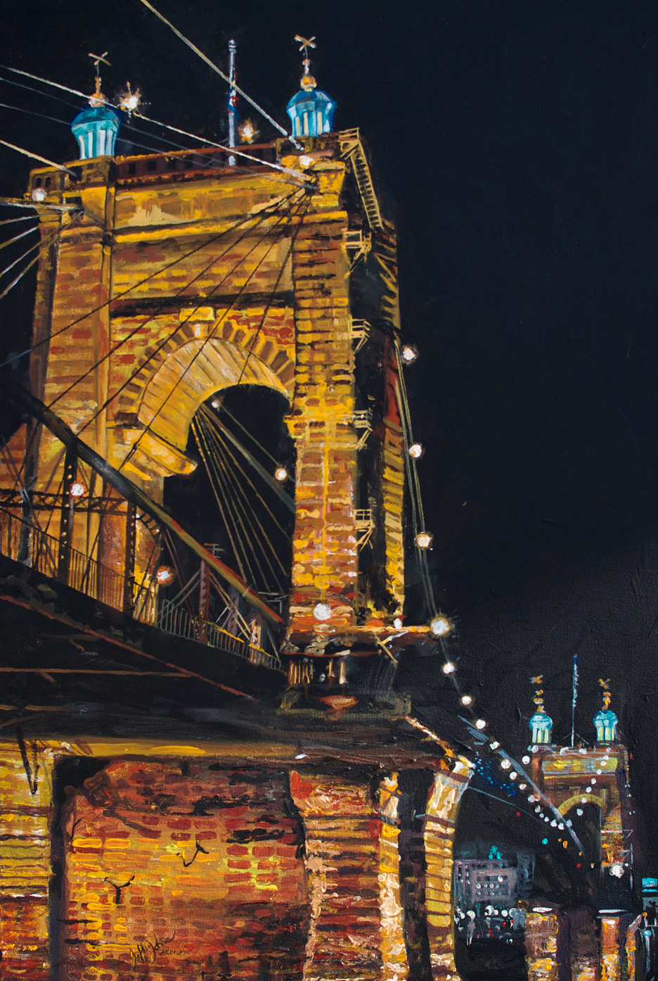 Here’s another painting inspired by the beautiful Cincinnati Skyline. This 24″ x 36″ acrylic on canvas painting of the historic John A. Roebling Suspension Bridge, titled Golden Evening Suspension. This painting showcases the strong foundation and vivid structure of this iconic Cincinnati landmark. The perspective for this piece is from Covington, Kentucky, so you’ll notice a small section of the Cincinnati skyline on the opposite side of the bridge.