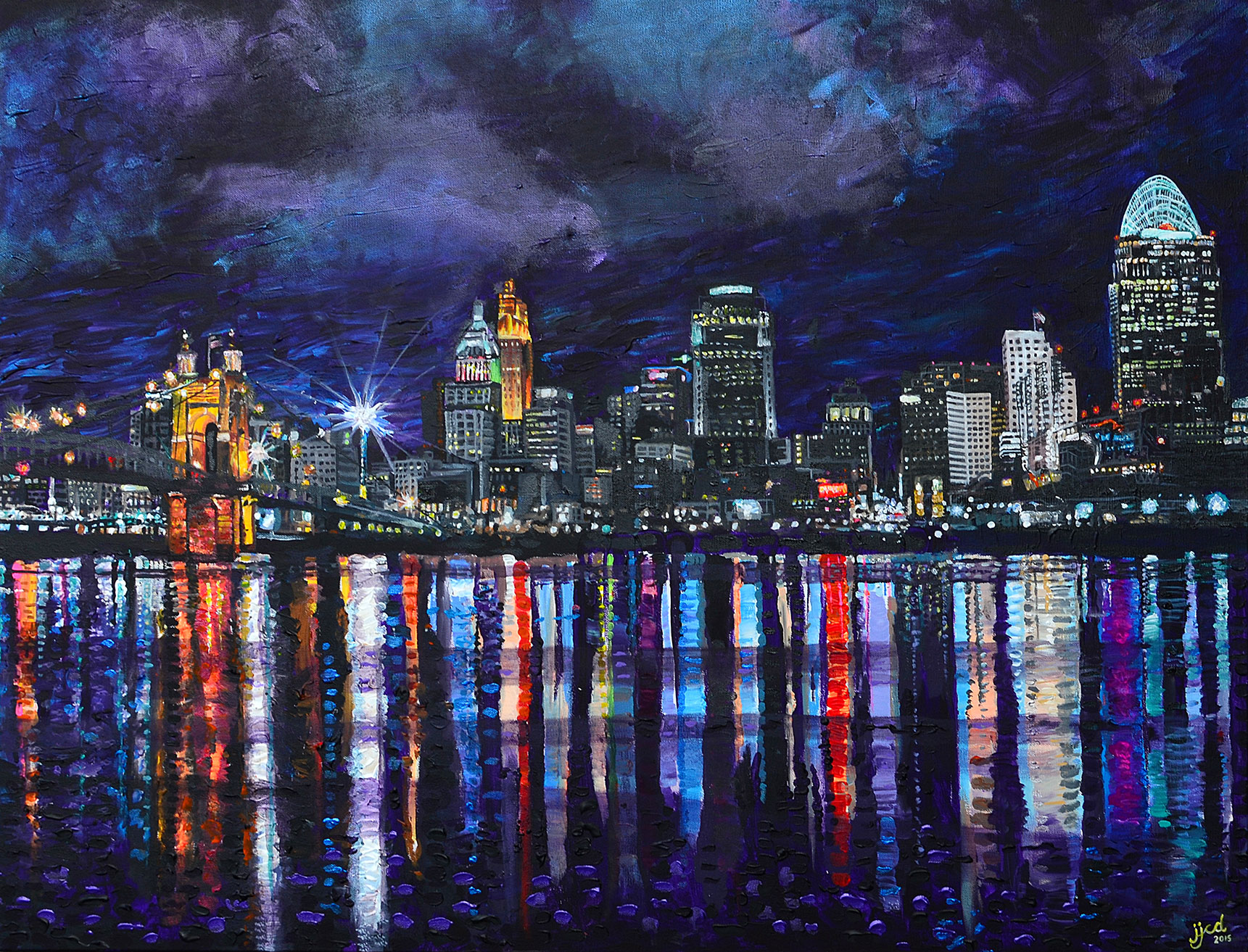 Here’s the final capture on this painting that captures the love between two sisters as they were on a family vacation in beautiful Amsterdam. The cobblestone moss filled roads, combined with the beautiful architecture really make this painting shine. There are multiple aspects to this painting that I really love. From a painting perspective I love the glow of light radiating from the right corner by the Juli Dans sign. The other component of the painting is that it really brings to life our passion of painting cities and combines it with human emotion. Thrilled with the final result and could not wait till our client had a chance to see it in person for the first time.