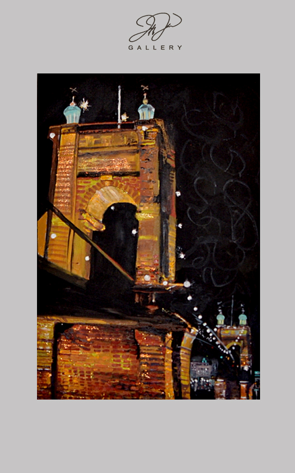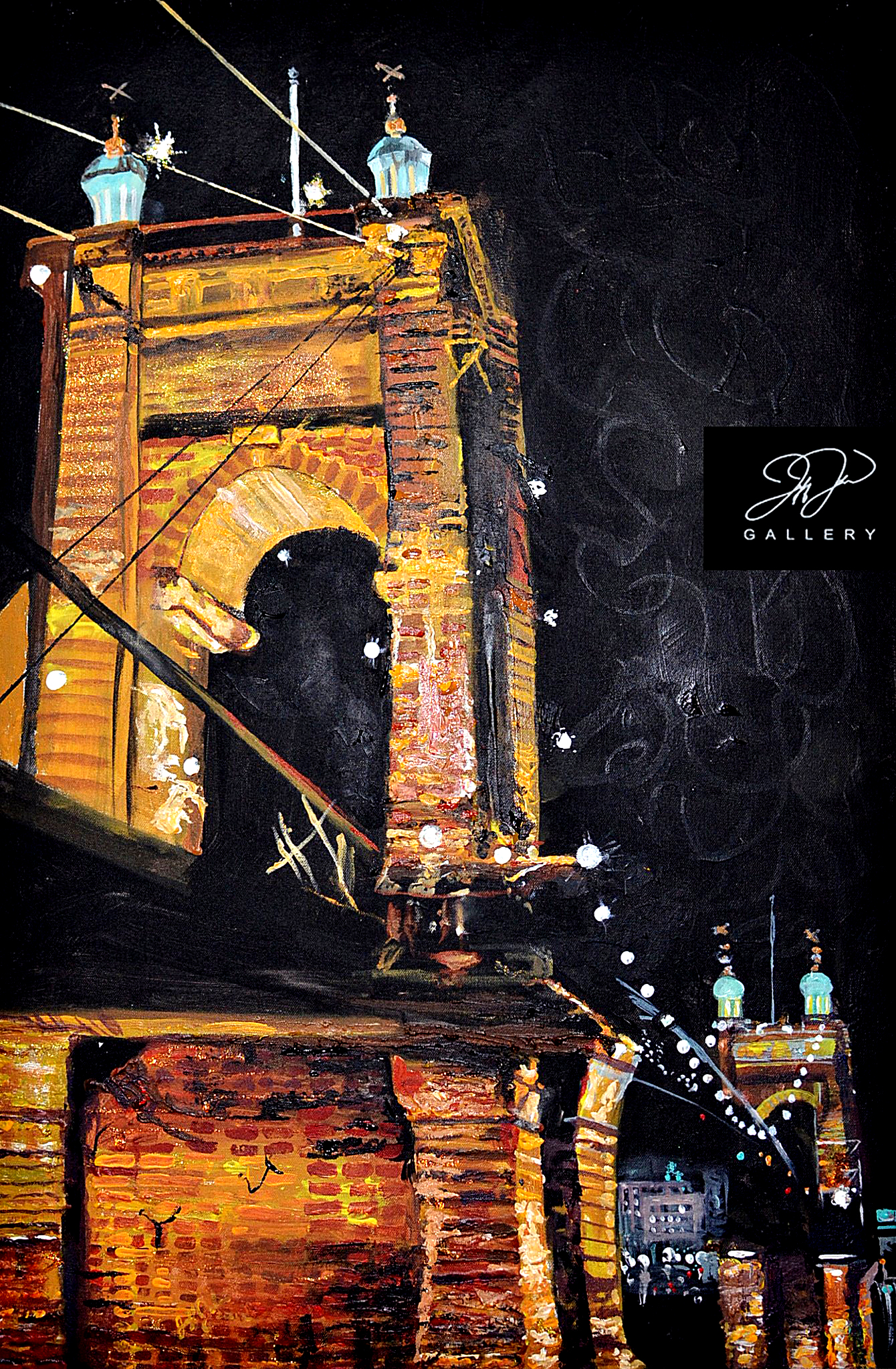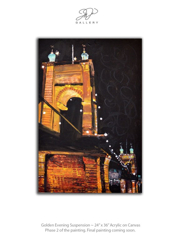 Here’s another painting inspired by the beautiful Cincinnati Skyline. This 24″ x 36″ acrylic on canvas painting of the historic John A. Roebling Suspension Bridge, titled Golden Evening Suspension. This painting showcases the strong foundation and vivid structure of this iconic Cincinnati landmark. The perspective for this piece is from Covington, Kentucky, so you’ll notice a small section of the Cincinnati skyline on the opposite side of the bridge.
