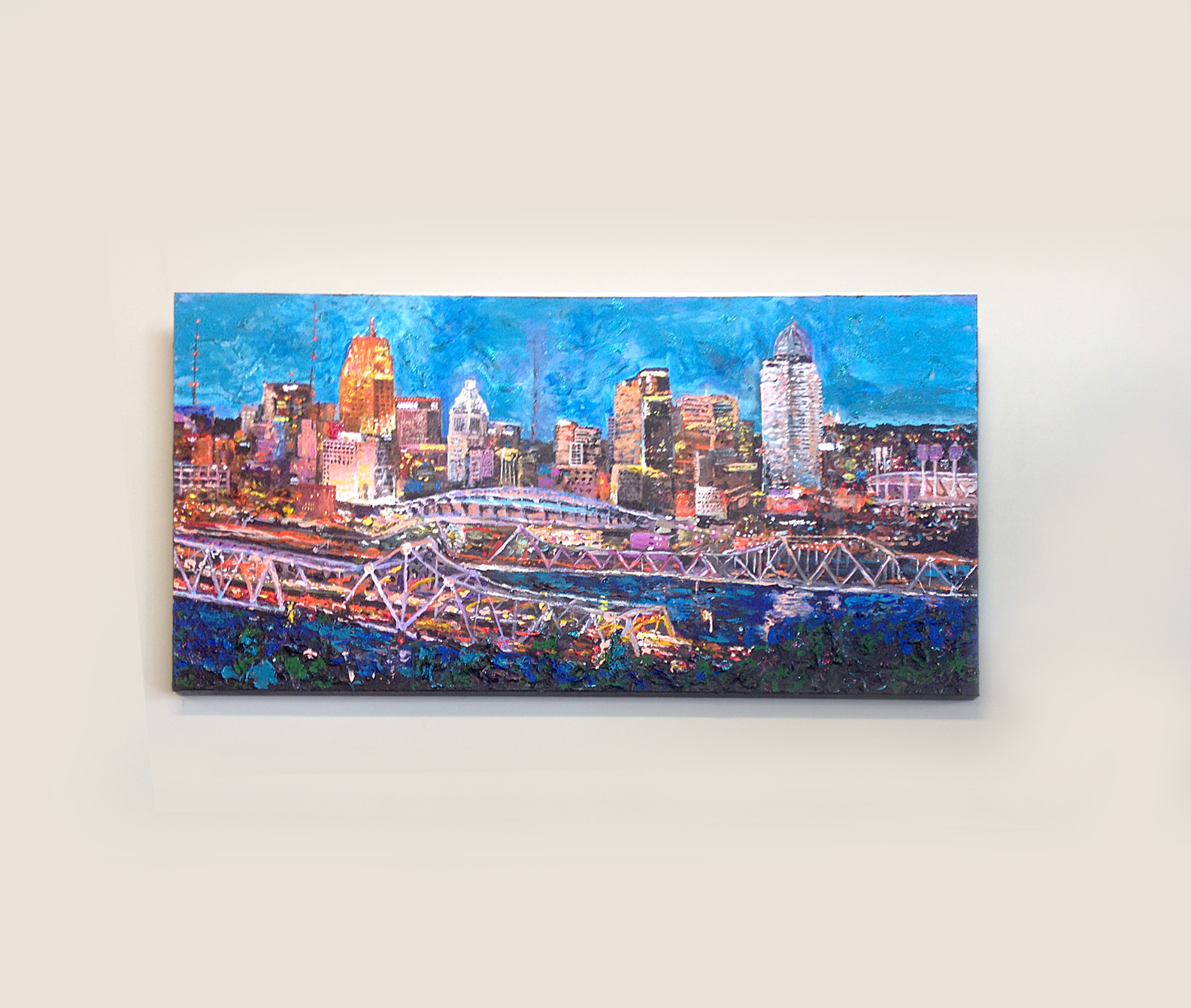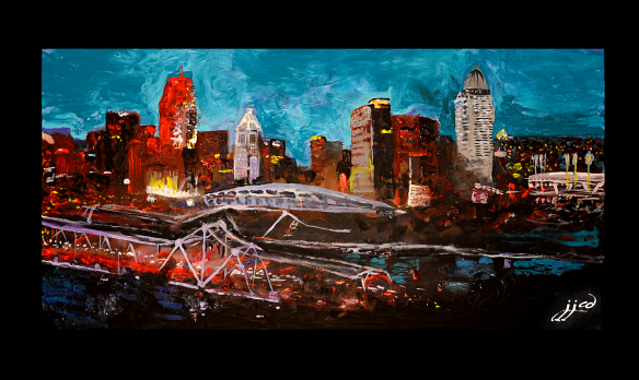 Bluffs View – Cincinnati Skyline – JJCD Posted on October 31, 2011 by jefferyjohns Reply 24″ x 48″ Acrylic on Canvas. Speed of Cincinnati captured on canvas. Another JJCD Collaboration Painting. Capturing Phase_1. More to come. Thanks, JJCD See above for updated progress on this painting. Thanks again.