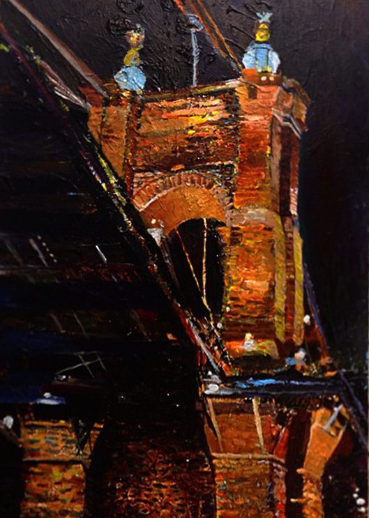 “We are absolutely pleased and enlightened with the beauty of the Roebling Bridge and the Cincinnati Skyline that is brought to life In this original acrylic painting by Jeff Johns and Colin Daugherty. Captured in vivid color and detail, a date stamp for this night has been created in this one of a kind painting. This artistic work is the focal point of our renovated condo on the Ohio River. We, and guests, will enjoy exploring this work for many years to come.”